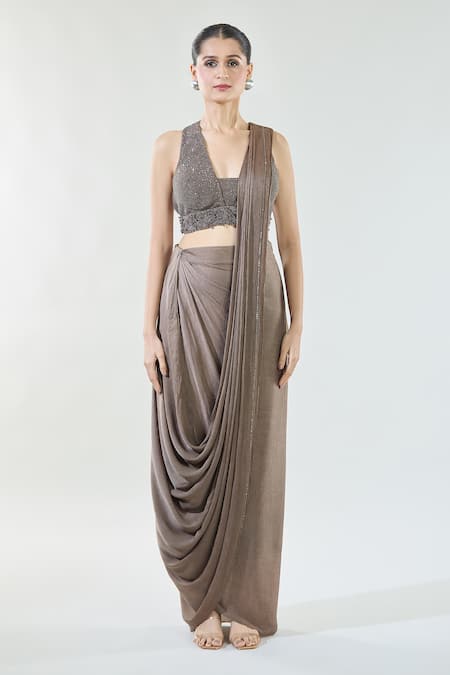 Umber brown pre-draped saree featuring intricate sequin detailing on the hem. Paired with a bead and sequin embroidered blouse with a blunt V neck design.