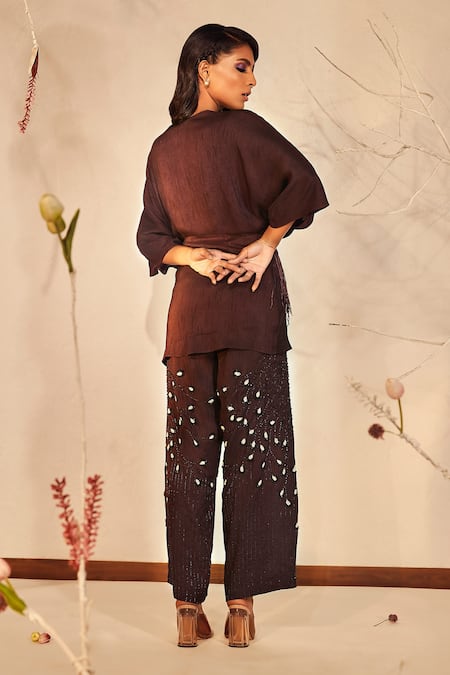 Buy_Babita Malkani_Wine Silk Sequins, Embroidery V-neck Fringed Kimono Top And Pant Set _Online_at_Aza_Fashions