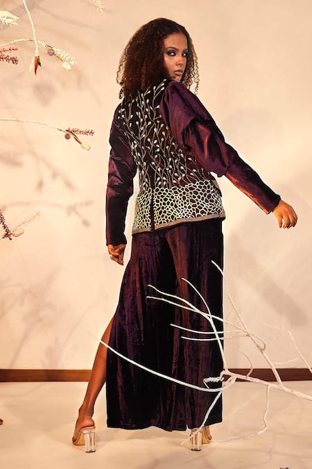 Wine velvet blazer featuring floral embroidery, thread work, and French knot details. Paired with matching side slit pant and concealed zipper closure.