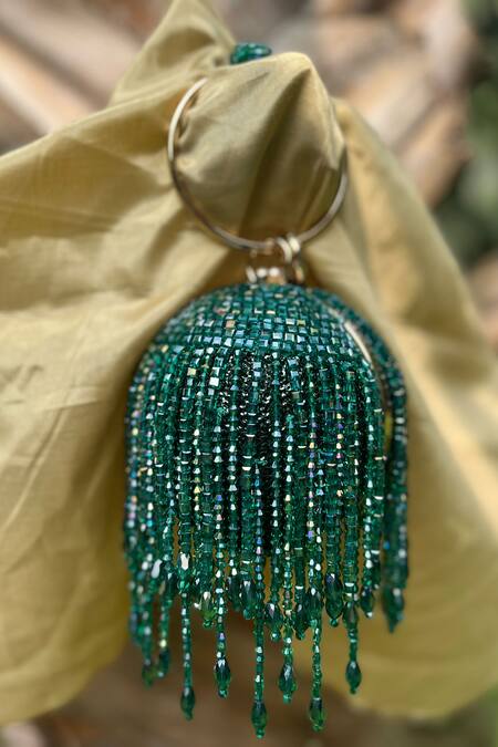 Crystal tassels create a dramatic effect, Bracelet handle for versatile carrying, Suede fabric adds a luxurious touch