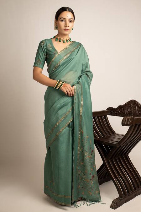 Green chanderi saree with placement printed motifs, sequin striped detail & tassel pallu. Comes with unstitched blouse piece.