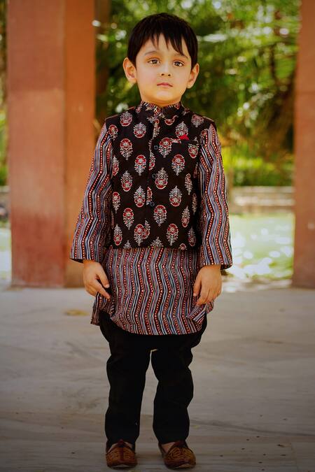 Black printed bundi featuring floral motifs in natural block prints. Paired with a chevron print kurta and solid pant.