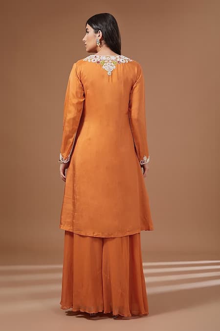 Buy_BAIDEHI_Orange Georgette Embroidery, Pearls Round Neck Floral Kurta And Palazzo Set _Online_at_Aza_Fashions