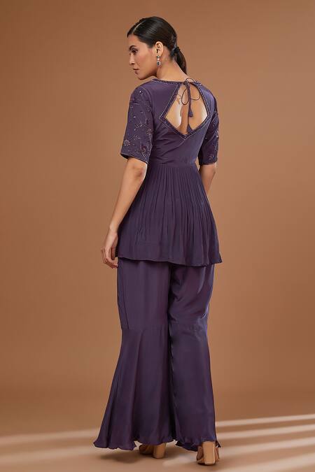 Purple peplum kurta featuring bead and sequin embroidered floral jaal motifs. Paired with matching sharara and scalloped hem dupatta.