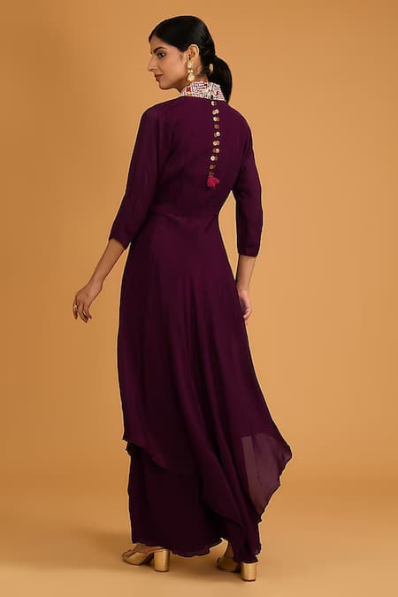 Wine crop top featuring a geometric neckline and paired with a hand-embroidered jacket. The ensemble includes palazzo pants designed for a relaxed fit.