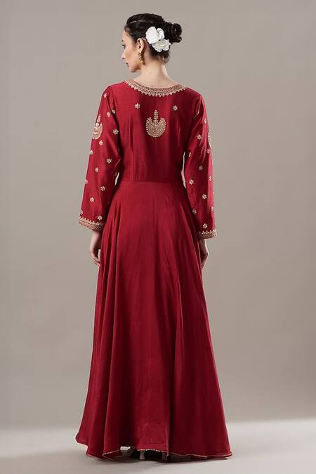 Red Anarkali featuring floral embroidery with gota-patti, resham, sequin, dori, and zari. Paired with a dupatta adorned with embroidered buttis.