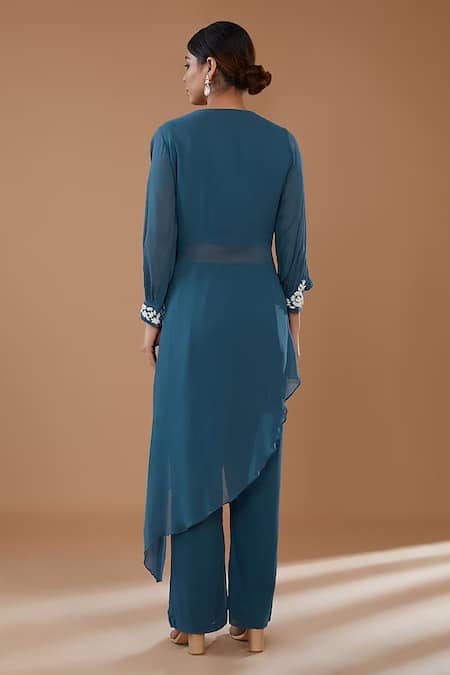 Blue high-low overlap tunic featuring sequins, pearl, and cutdana embroidery. Paired with coordinating straight pant with attached inner lining.