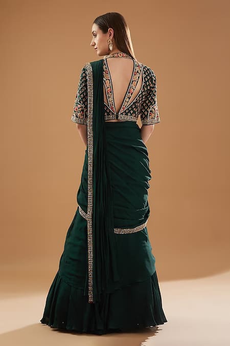 Bottle green silk and chinon georgette pre-draped lehenga saree featuring an attached cancan. It includes a padded blouse with intricate hand embroidery using cutdana, dabka, pearls, thread, zari, and sequins, along with a matching belt.