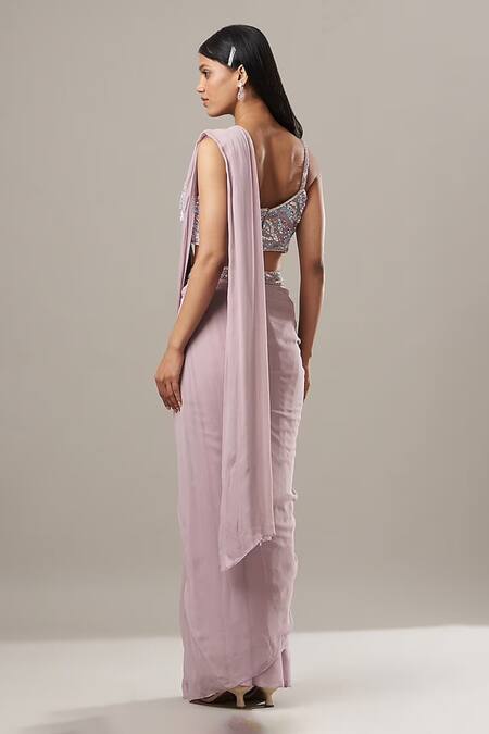 Purple Georgette Sequins, Cut Work, Embroidered Pre-draped Saree With Bustier