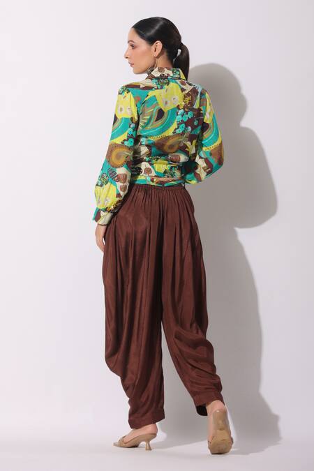 Buy_Bairaas_Green Top Muslin Printed Leaf Notched Collar Abstract And Draped Pant Set_at_Aza_Fashions