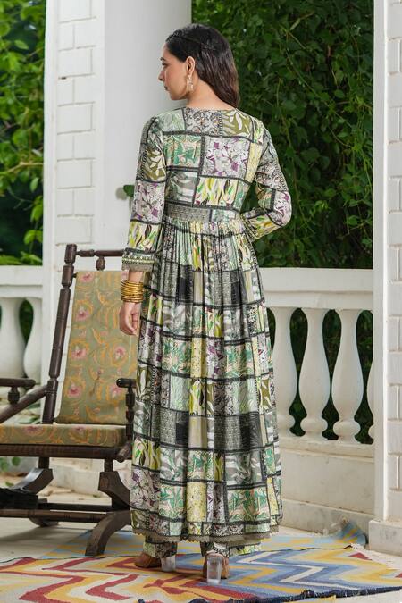 Buy_Bairaas_Green Muslin, Lining Cotton Floral V Neck Block Print Shrug With Pant Set_Online_at_Aza_Fashions