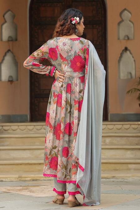 Buy_Bairaas_Grey Cotton, Chiffon Mirrors, Bougainvillea Bloom Print Anarkali Pant Set_at_Aza_Fashions