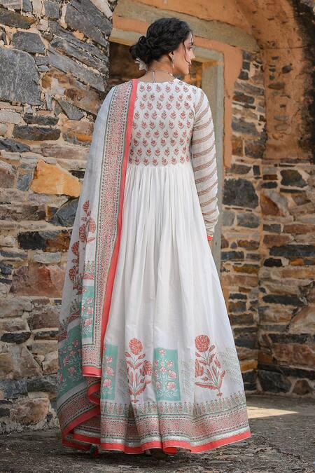 Buy_Bairaas_Peach Mul Cotton Block Print, Sequin Blunt V Neck Floral Anarkali With Dupatta_Online_at_Aza_Fashions
