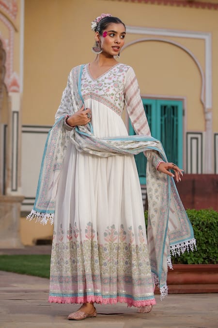 Buy_Bairaas_White Cotton, Muslin Mirrors, Lace, Floret Block Print Anarkali With Dupatta_at_Aza_Fashions