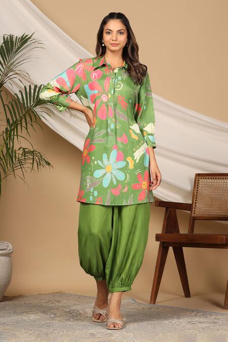 Green collared neck kurta with all-over floral prints. Comes with plain afghani pant.