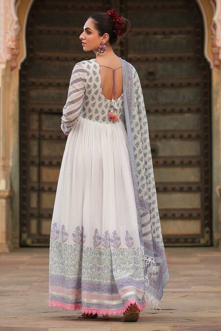 Buy_Bairaas_White Mul Cotton Printed Block V Neck Flower Anarkali With Dupatta_Online_at_Aza_Fashions