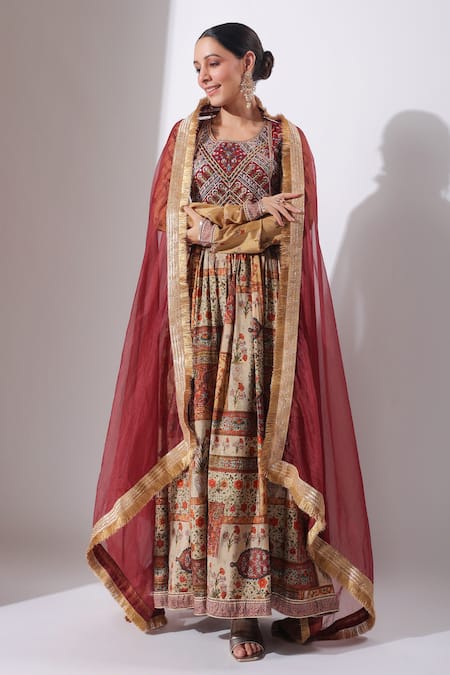 Buy_Bairaas_Maroon Organza Embroidery Round Flower Embellished Yoke Anarkali With Dupatta