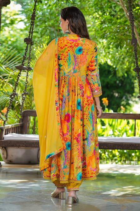 Yellow floral printed angarkha anarkali featuring a V neck and three quarter sleeves. Paired with a salwar and a chinon dupatta.