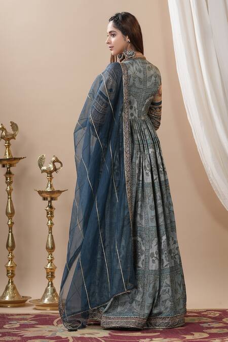 Lavish blue anarkali featuring all-over flower embroidery on the yoke and lace trims. Paired with a delicate organza dupatta.