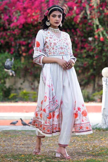 White front cut embroidered anarkali with fruit & floral print. Paired with pant & printed dupatta.