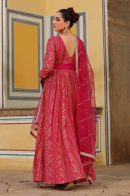 Cherry red geometric printed anarkali with embellished waistband Paired with organza gota work dupatta.