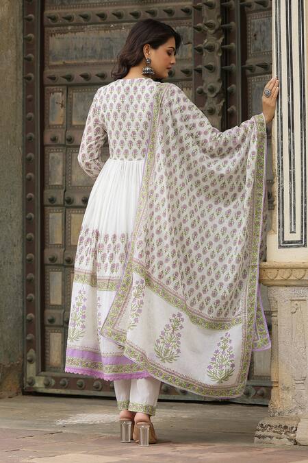 Buy_Bairaas_Purple Cotton Sequins, Embroidery Hand Block Print Angrakha Anarkali Pant Set_Online_at_Aza_Fashions