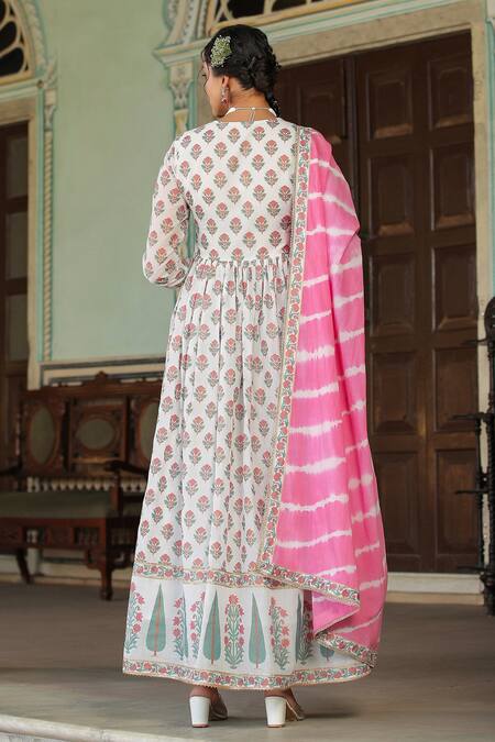 Buy_Bairaas_Pink Mul Cotton Printed Mughal V Neck Block Anarkali With Dupatta_at_Aza_Fashions