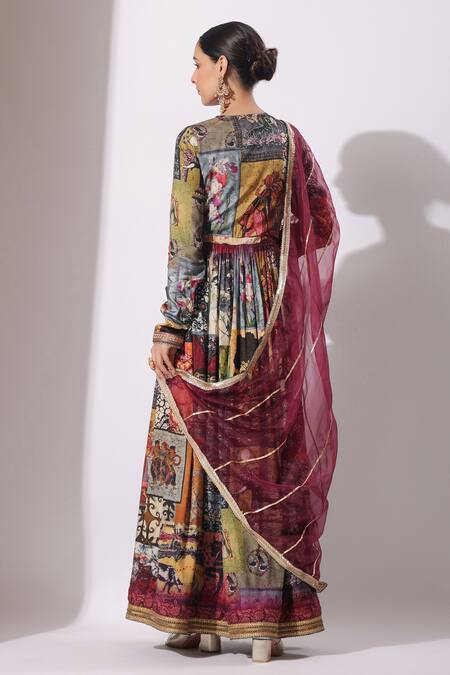 Buy_Bairaas_Maroon Anarkali Dola Silk Printed Persian Art Blunt V With Dupatta