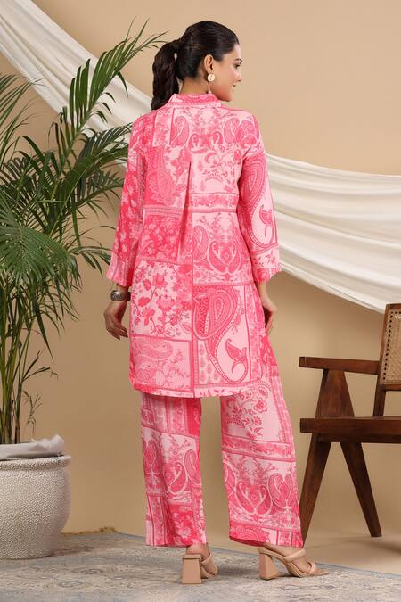 Buy_Bairaas_Pink Muslin Printed Persian Shirt Collar High Low Tunic And Pant Set