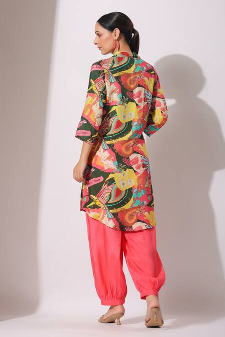 Multi color three fourth sleeves collared kurta with all over quirky bloom print. Paired with a coral pink afghani pant.