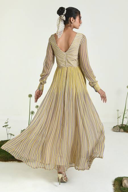 Buy_Baise Gaba_Yellow Chiffon V-neck Sunbeam Striped Maxi Dress_at_Aza_Fashions