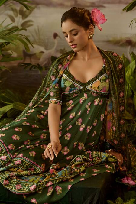Green flared anarkali featuring all-over multi-color floral print and intricate pleated details. Paired with a printed pant and dupatta, it showcases contrast sequin, beads, and cut dana hand embroidery on the sweetheart neck.