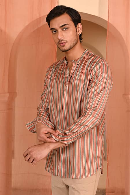 Multi Color Chanderi Striped Mandarin Collar Shirt