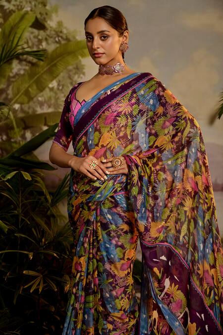 Purple saree featuring tropical print and bead embroidered border. Paired with a padded blouse showcasing lotus and blossom patchwork print with thread, sequin, and cutdana embroidery.