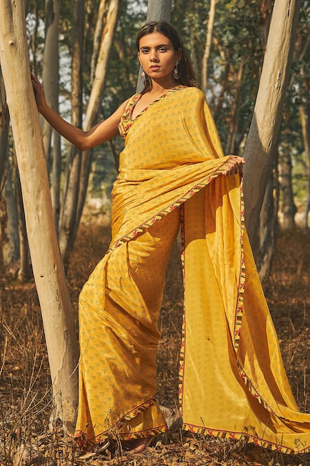 Yellow saree in natural crepe fabric with contrast border & all-over polka dot motifs in geometric pattern. Comes with hand embroidered natural crepe blouse piece.