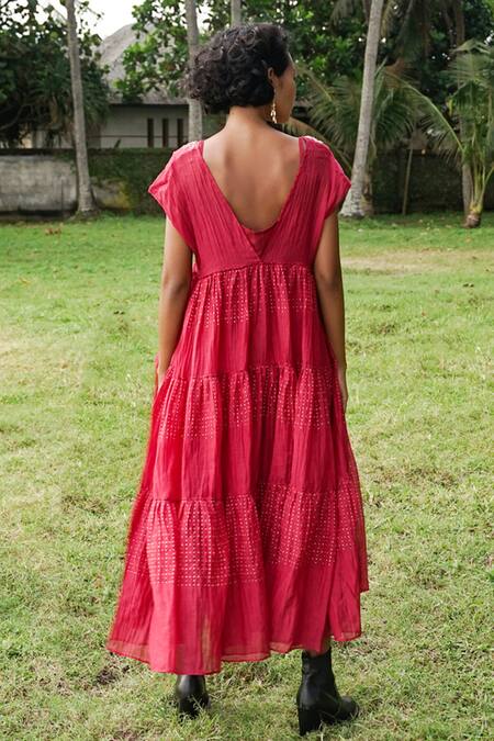 Red 40% , 60% , Chanderi Floral Bry Long Tiered Dress