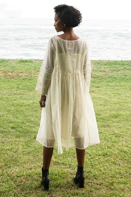 Ivory long kurti with delicate lace panel on the yoke. Comes with a short tonal slip.