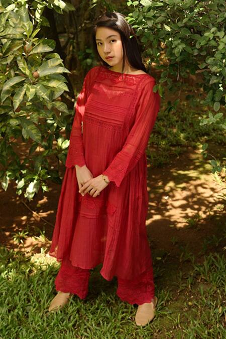 Purple tunic featuring lace embroidered and paneled yoke with full sleeves. Accompanied by a short tonal slip.