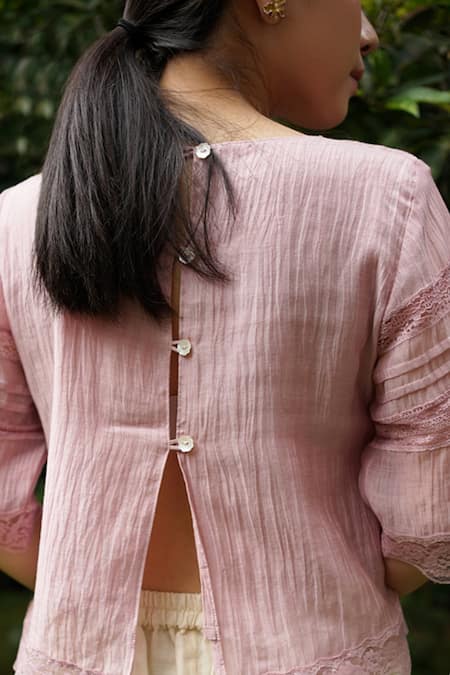 Shell flower button opening at back, Attached lining for comfort, Lace details along the hem