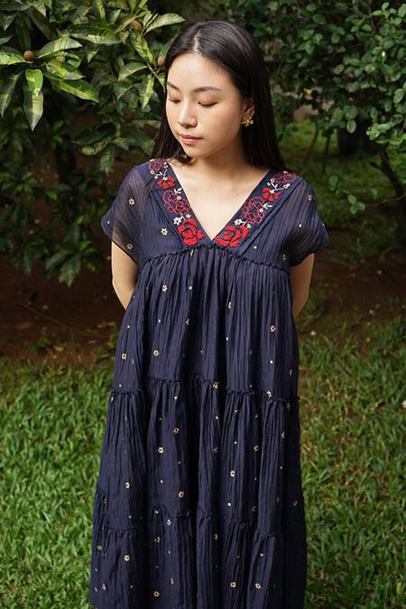 Midnight blue chanderi cotton silk midi dress featuring handcrafted floral embroidery and a low back. It comes with an inner layer for added comfort.