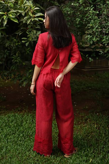 Red Chanderi Cotton, Silk Lace Work Blouse