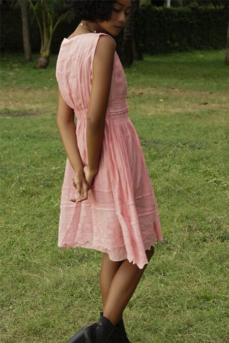 Pink dress with delicate cotton laces and soft pintuck on the bottom. Comes with a tonal inner slip.