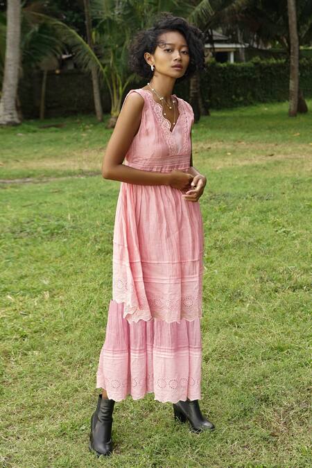 Pink layered dress with delicate cotton laces and soft pintuck on the bottom. Comes with a tonal inner slip.