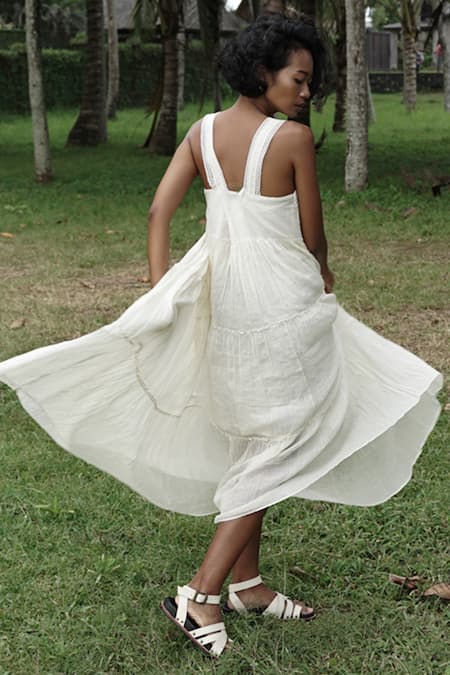 Ivory long dress with delicate laces and fabric pintuck at the bottom of the dress, gathered side yoke and detailed lace.