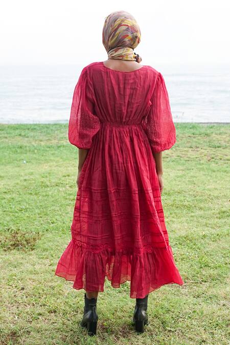 Red dress with pintuck on the front body, attached laces on the front panels with gathers and three quarter bishop sleeves. Comes with an inner.