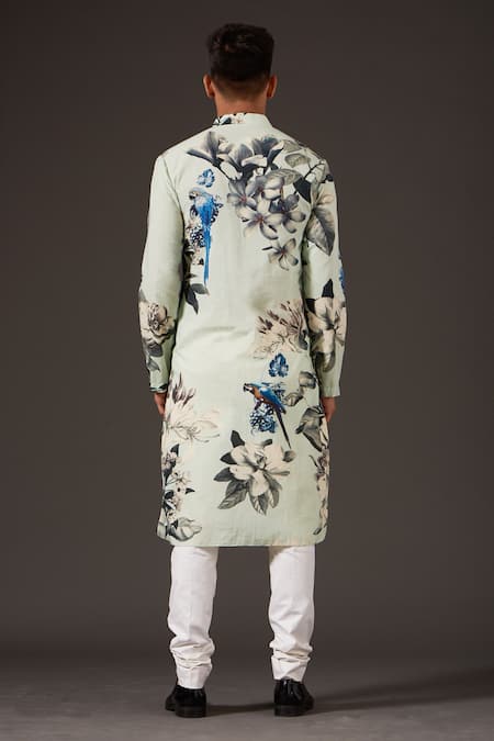 Sea green kurta with bird, floral printed motifs & front buttons. Paired with churidar.