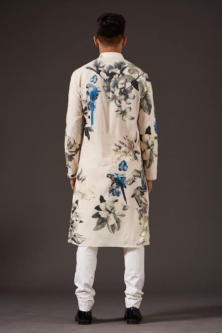 Ivory kurta with bird, floral printed motifs & front buttons. Paired with churidar.