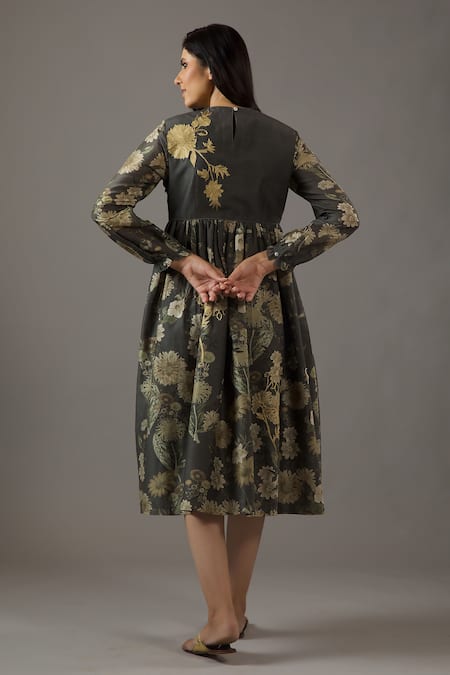 Grey midi dress featuring floral printed motifs and a gold embroidered bodice