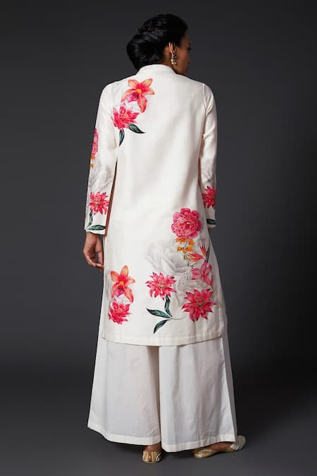 Ivory kurta with floral printed motifs & mandarin collar. Paired with palazzo.