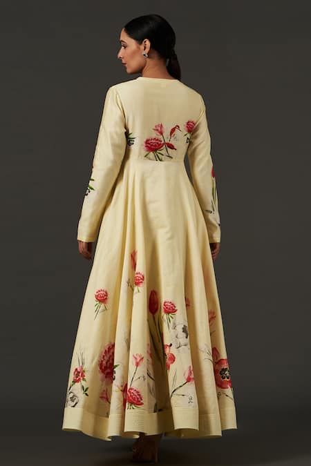 Lemon yellow anarkali with floral printed motifs & keyhole neckline. Paired with cotton churidar & net dupatta.